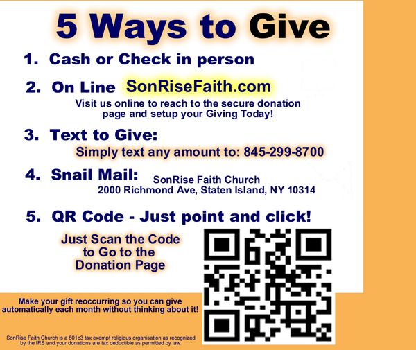 Please Consider making SonRise faith Church a one time, offering, or reoccurring donation. for your tithes.